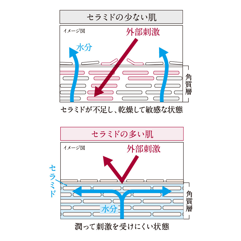 セラミドは人の肌に存在する成分の一種で、肌の潤いを保つ重要な役割を果たしています。セラミドの少ない肌では、外部からの刺激に敏感になったり、化粧水が浸透しづらくなってしまいます。