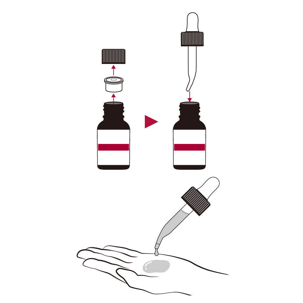 原液(10mL)の外蓋と中栓を外し、本品を容器に装着します。原液を使用する際は、ゴム部分をつまんで原液を吸い上げ、手のひらに適量を垂らしてください。使用後は容器に戻し、キャップをしっかりと閉めてください。