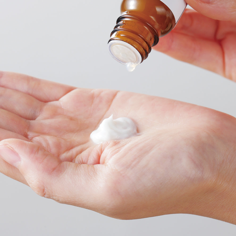 その日の肌の状態に合わせて、原液をプラスしてもお使いいただけます。「原液*保湿クリーム」適量を手のひらにとり、肌悩み*²に対応する原液を適量(1~2滴ほど)加え、手のひらで混ぜ合わせてから、いつものスキンケアと同じように顔になじませます。