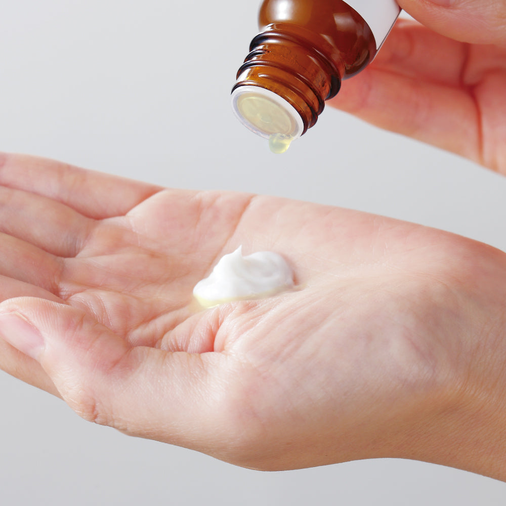 化粧水の後、適量(2~3滴)を手にとり、顔全体にやさしくなじませて、しっかりと浸透*させます。