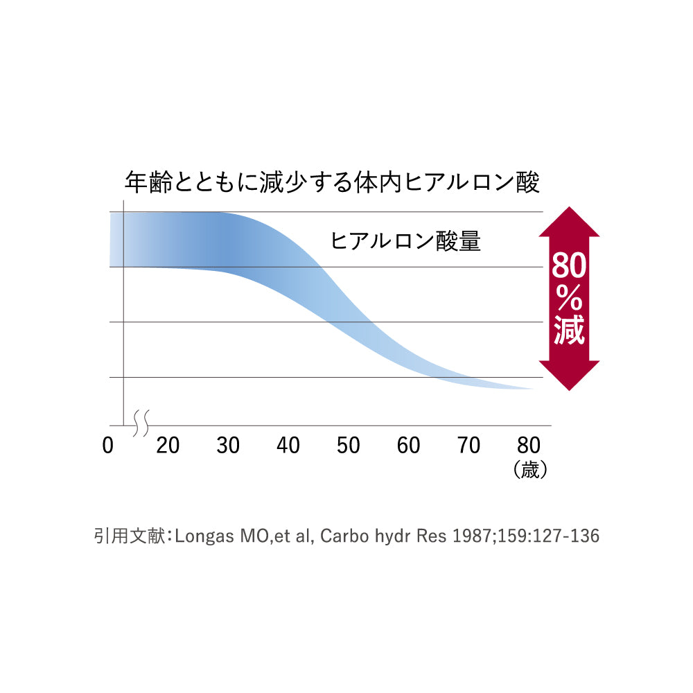 ヒアルロン酸は年齢とともに減少し、60代では20代の半分になると言われています。赤ちゃんのお肌がもっちりとしているのはヒアルロン酸を多く含んでいるからです。