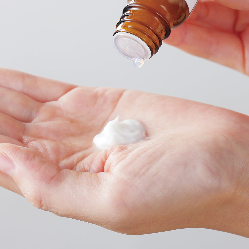 化粧水の後、適量(2~3滴)を手にとり、顔全体にやさしくなじませて、しっかりと浸透*させます。