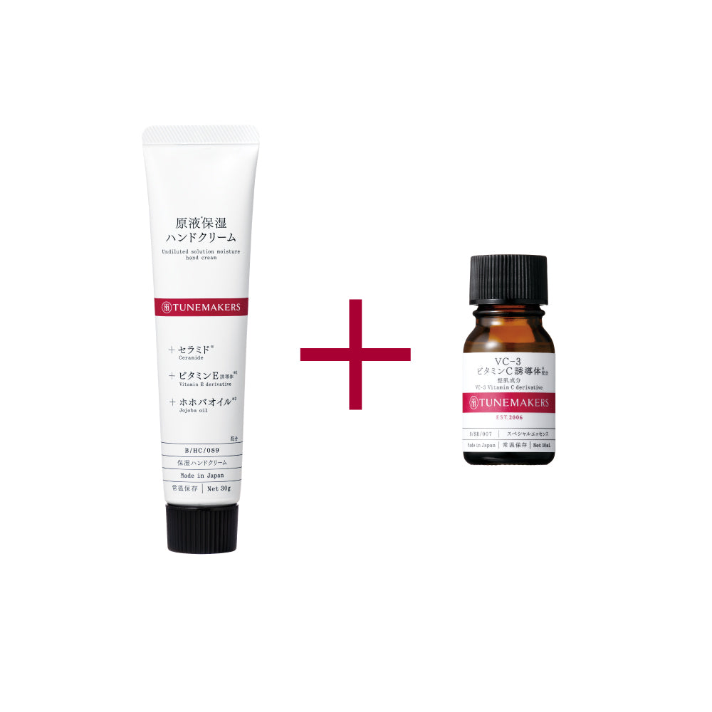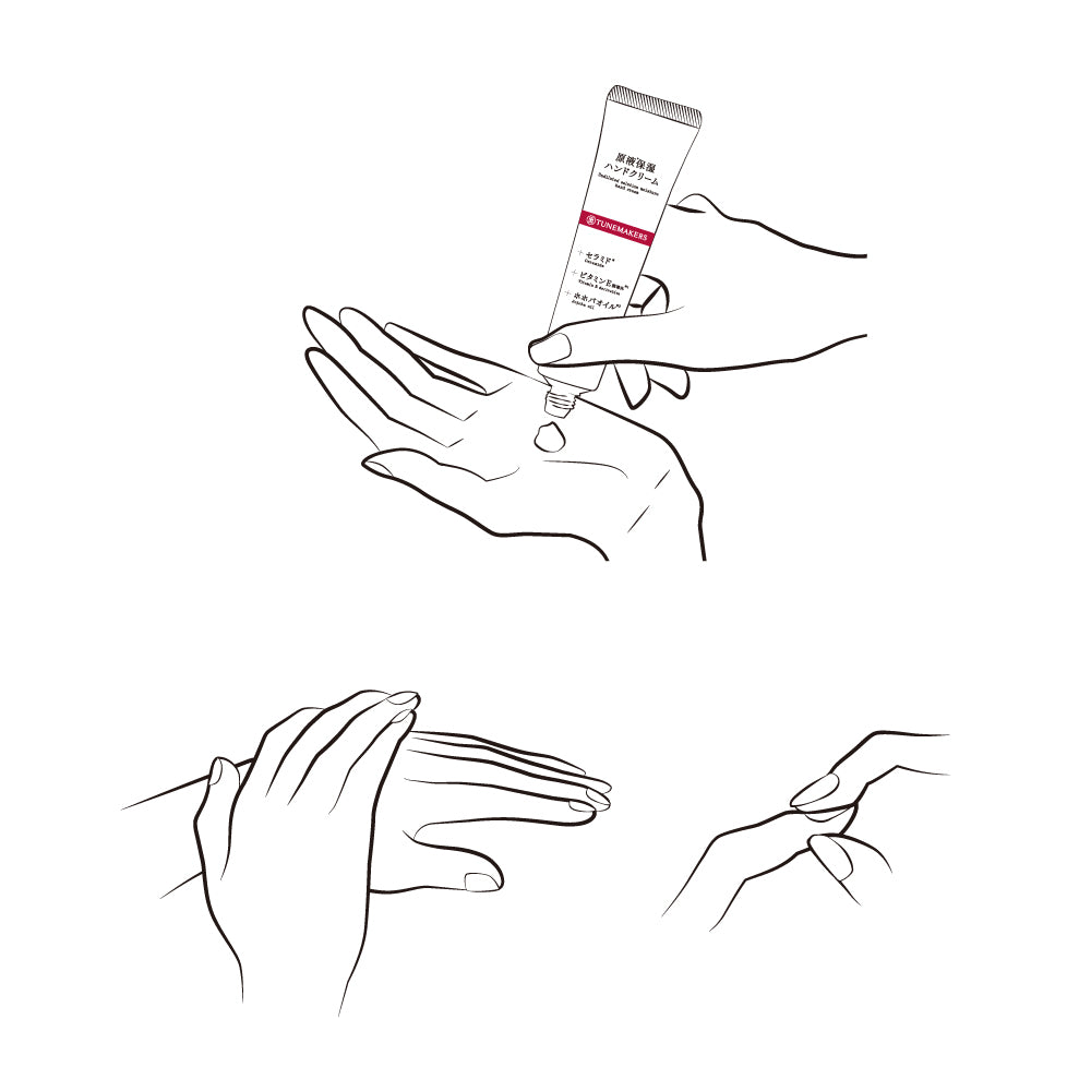 「原液*¹保湿ハンドクリーム」適量を手にとり、「VC-3 ビタミンC誘導体※配合」原液を適量(1~2滴)加え、混ぜ合わせてから手肌や爪になじませます。
