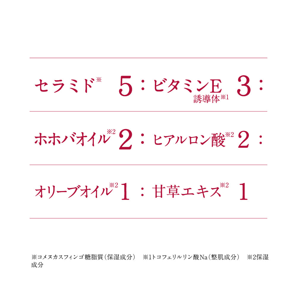 *チューンメーカーズ「セラミド(コメヌカスフィンゴ糖脂質(保湿成分))」「ビタミンE誘導体(トコフェリルリン酸Na(整肌成分))」「ホホバオイル(保湿成分)」「ヒアルロン酸(保湿成分)」「オリーブオイル(保湿成分)」「甘草エキス(保湿成分)」 *1角質層まで